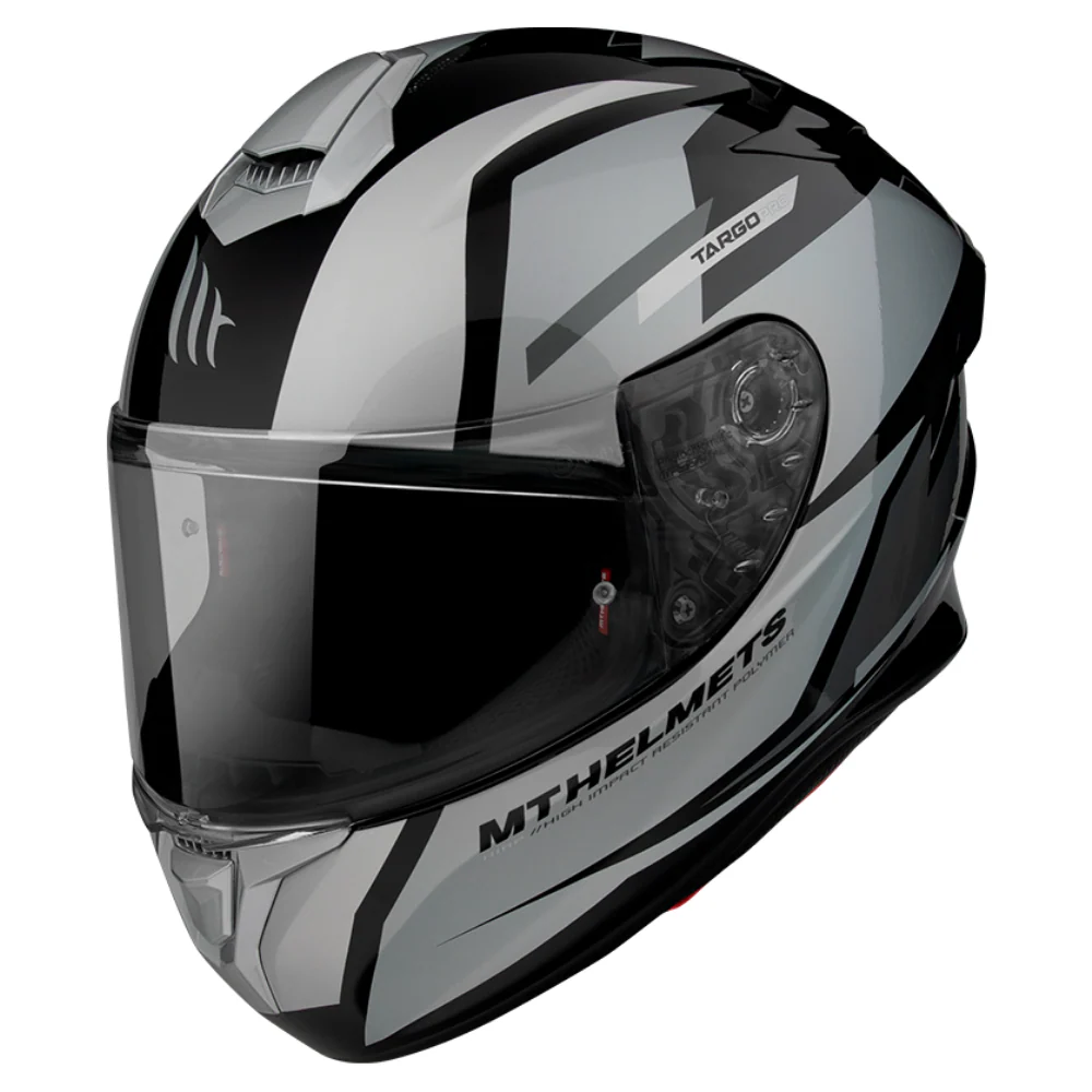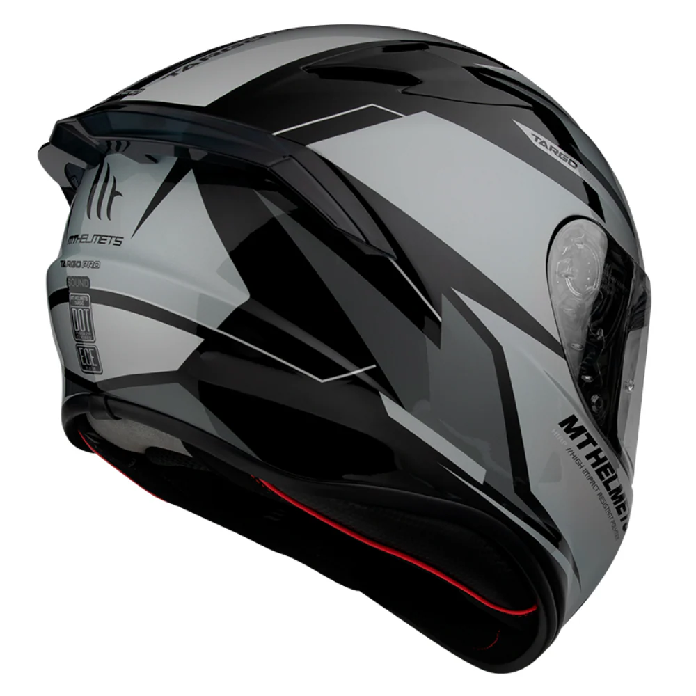 El nuevo MT TARGO PRO es la versión más deportiva del MT TARGO, al incorporar un nuevo alerón trasero. El TARGO PRO es un casco con una terminación increíble. Incorpora la nueva pantalla V-14, de 2,2mm de grosor, con nuevos mecanismos de fácil extracción y cierre perfecto, apertura central, ventilación interna, cierre micrométrico metálico y ventilaciones pintadas al color del casco.